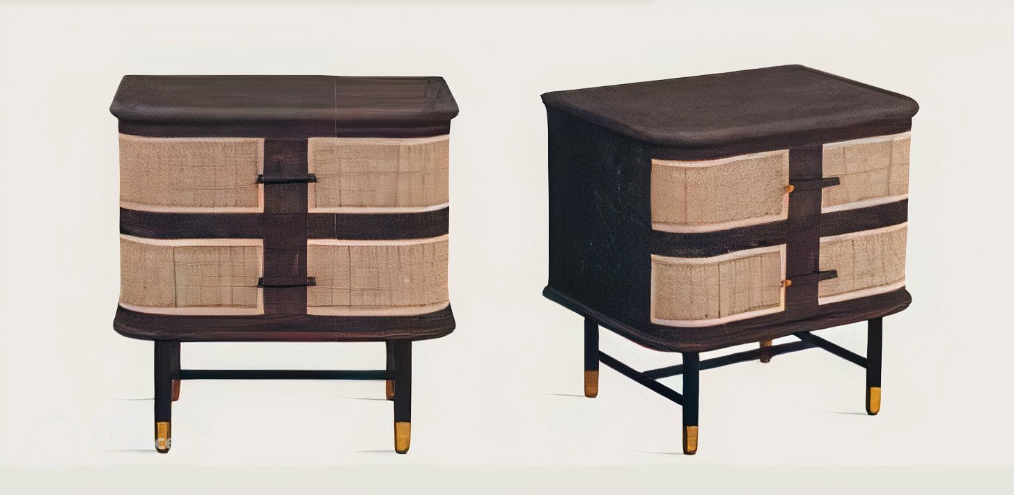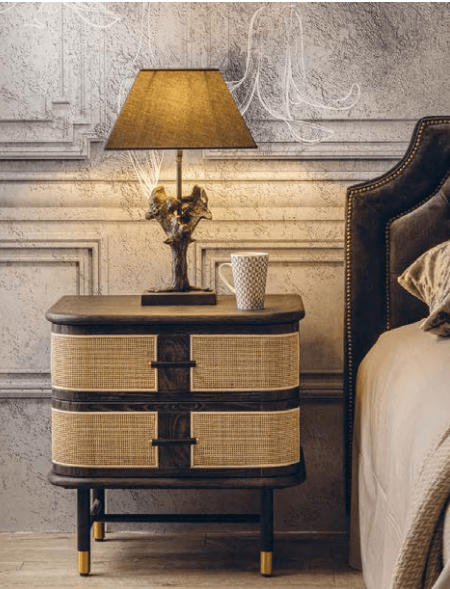 Made of layered wood, lacquered solid Oak wood in Burnished color and ribbed. Grafite-coloured metal base with brass feet. Handcrafted.