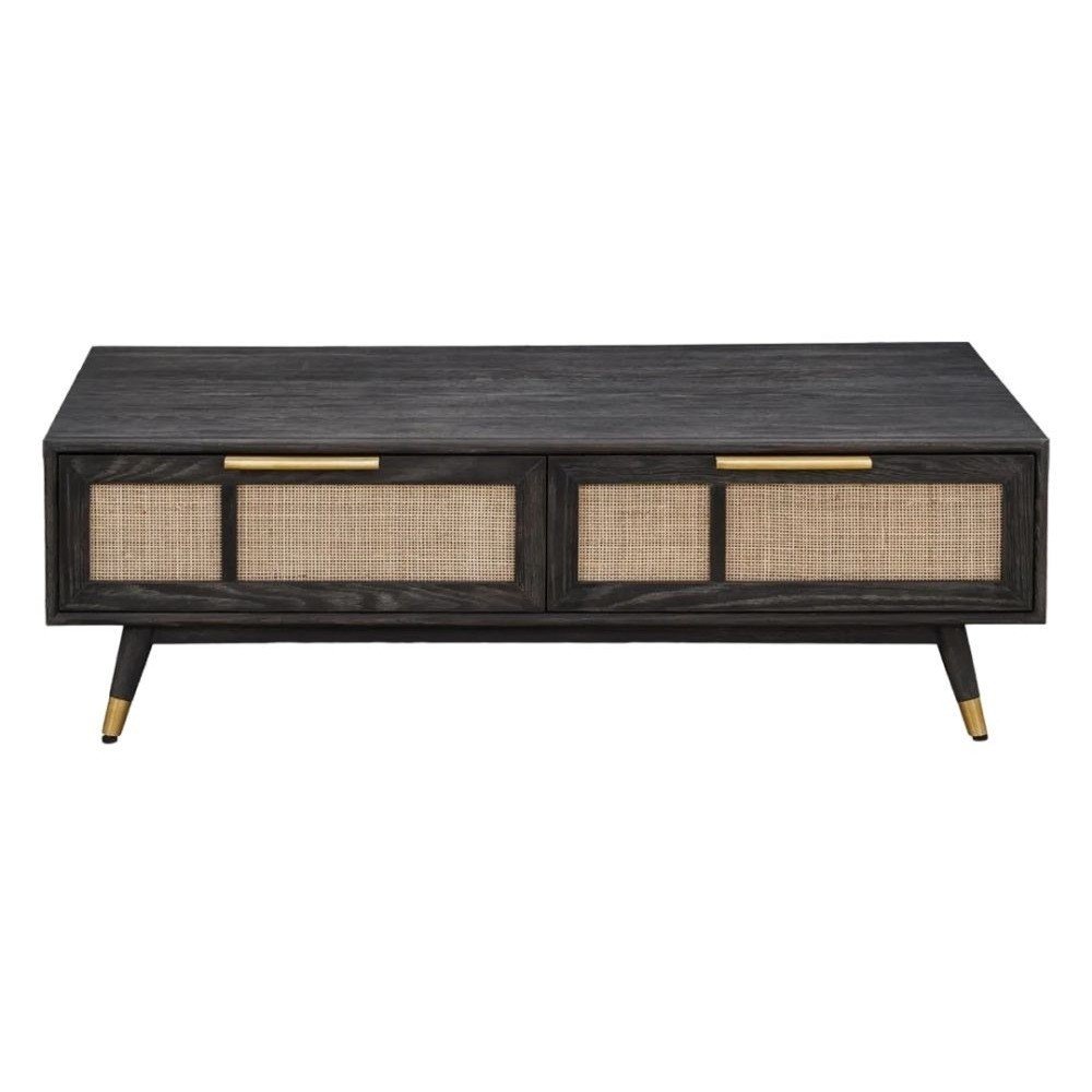 2-drawer rectangular coffee table with handles. Made of layered wood and natural solid Oak wood lacquered in Burnished color, with ribbed and braided drawer fronts. Wooden base with brass feet. Handcrafted