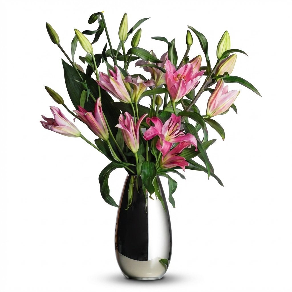 By designer Andreas Ostwald, these contemporary vases love robust and luxurious surroundings. Their impeccable workmanship, made of an stainless steel-nickel material mix, also carries some visual weight, and nothing is likely to knock it down anytime soon. They are most comfortable in three different shapes and sizes combined with lush bouquets of flowers in entrance halls, living rooms, offices, or restaurants.