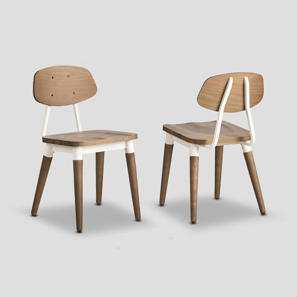 Chair with metal frame, wooden seat, and backrest in natural finish. Handcrafted