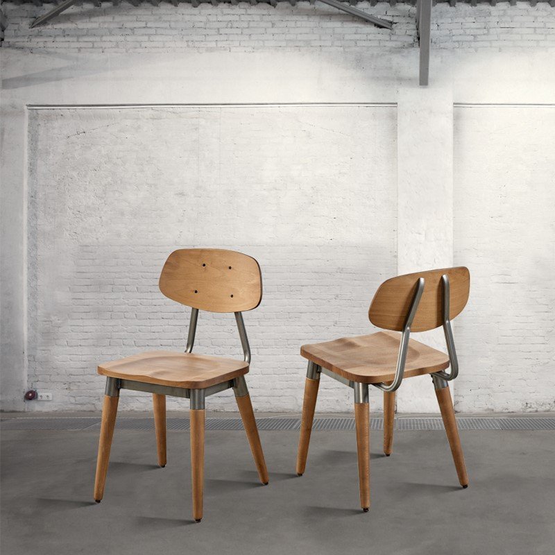 Chair with metal frame, wooden seat, and backrest in natural finish. Handcrafted