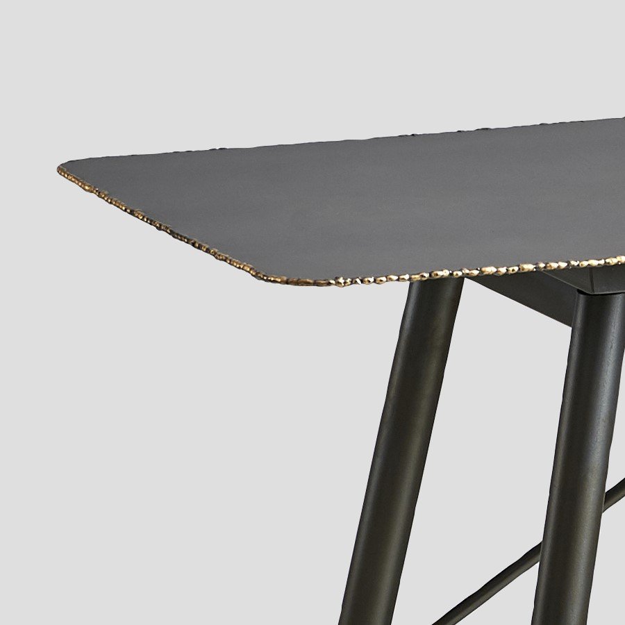 Double-sided console with metal frame in Graphite color and brass feet. Top with decorative perimeter welding in brass finish. Handcraft.