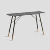 Console with top made of layered wood and solid Mindi wood in natural finish. Metal frame in Light Brass color and Vienna straw lower shelf.