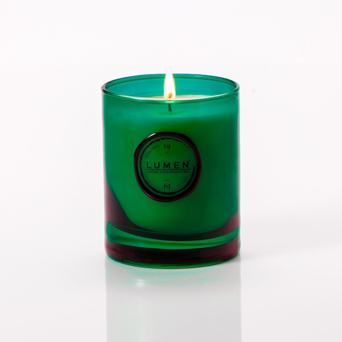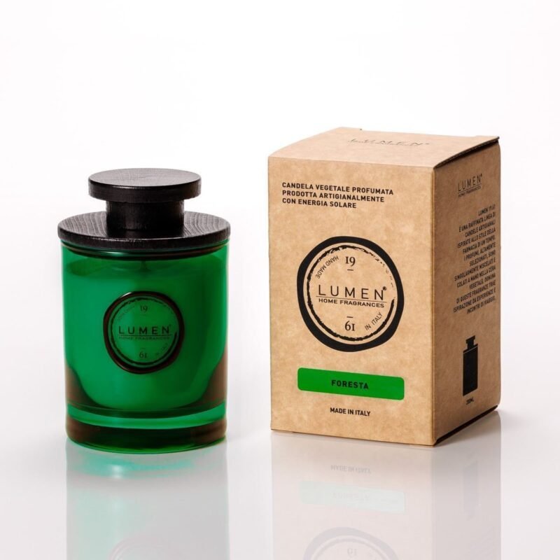 Green glass vegetable candle with black wooden pharmacy lid, FCS certified cardboard packaging