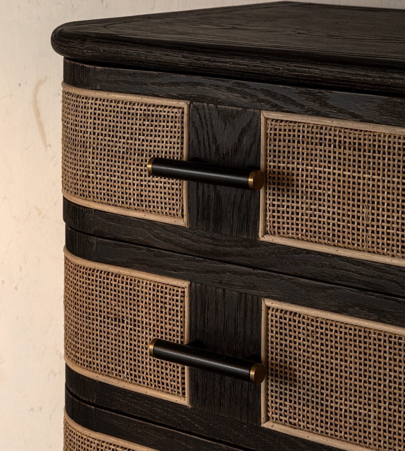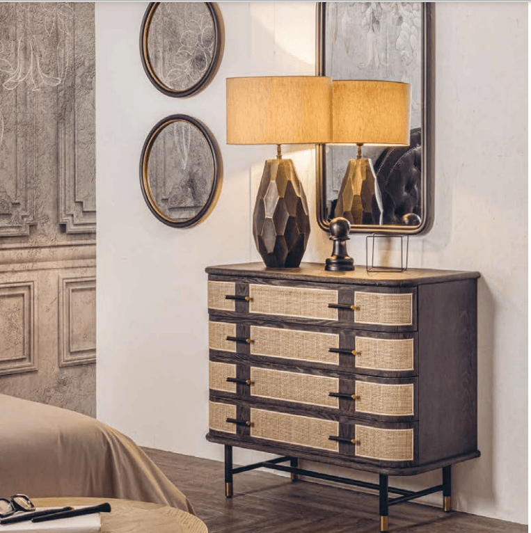4-drawer dresser with handles. Made of layered wood, lacquered solid Oak wood in Burnished color and ribbed. Graphite-coloured metal base with brass feet. Handcrafted