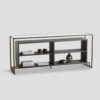 Console with top made of layered wood and solid Mindi wood in natural finish. Metal frame in Light Brass color and Vienna straw lower shelf.