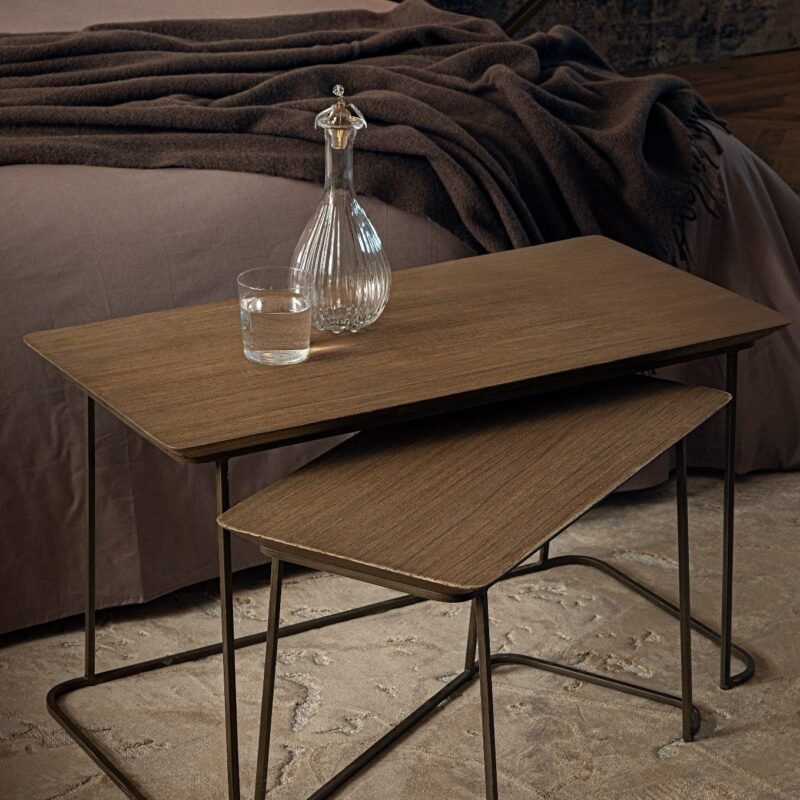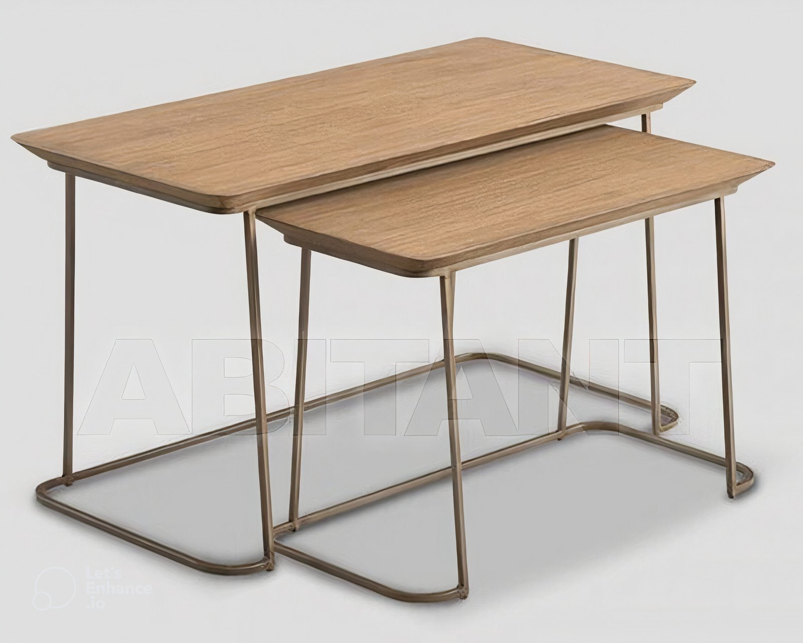 Side tables with metal frame in Light Brass finish and tabletop made of Mindi wood in natural finish. Handcrafted