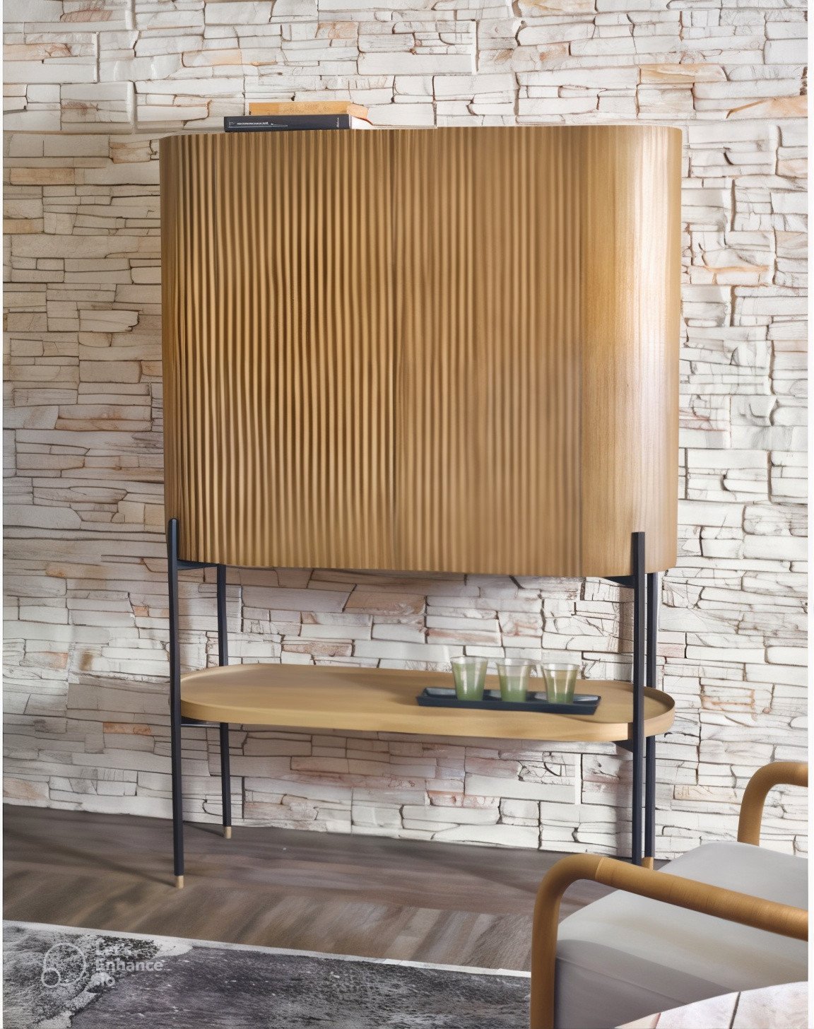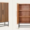 A two-door cabinet with inner shelves, it is made of layered wood and solid Mindi wood in a natural finish. The metal base is Graphite with brass feet. It is handcrafted.