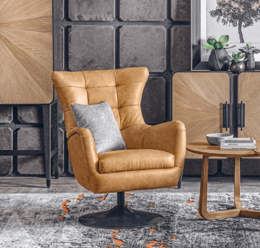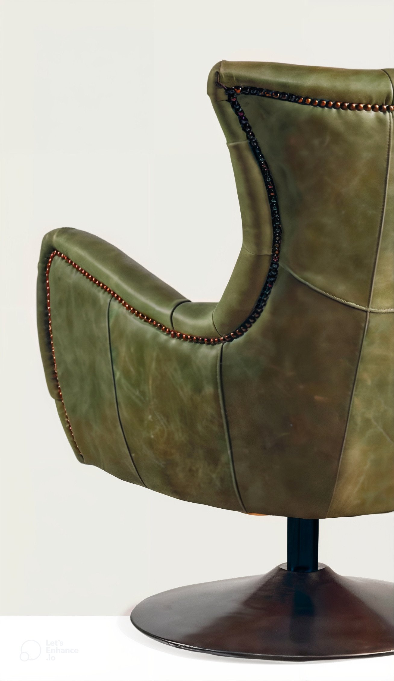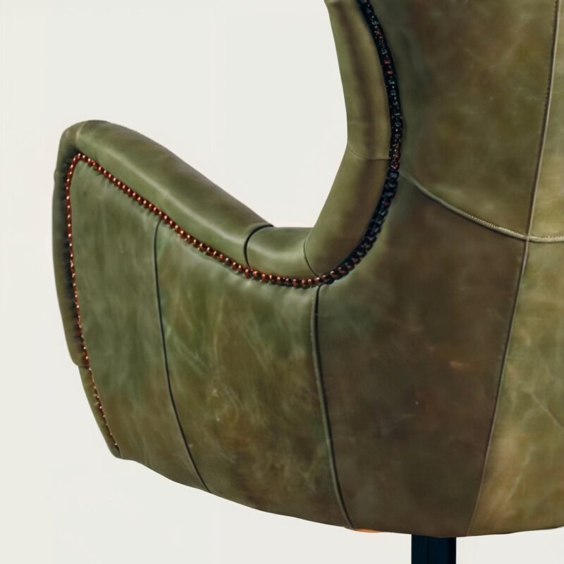 Upholstered swivel armchair with armrests, genuine leather covering with Caption finish. Metal base in deferent colors. Handcrafted.