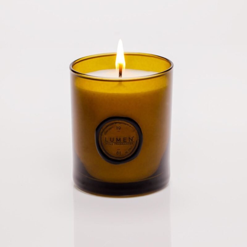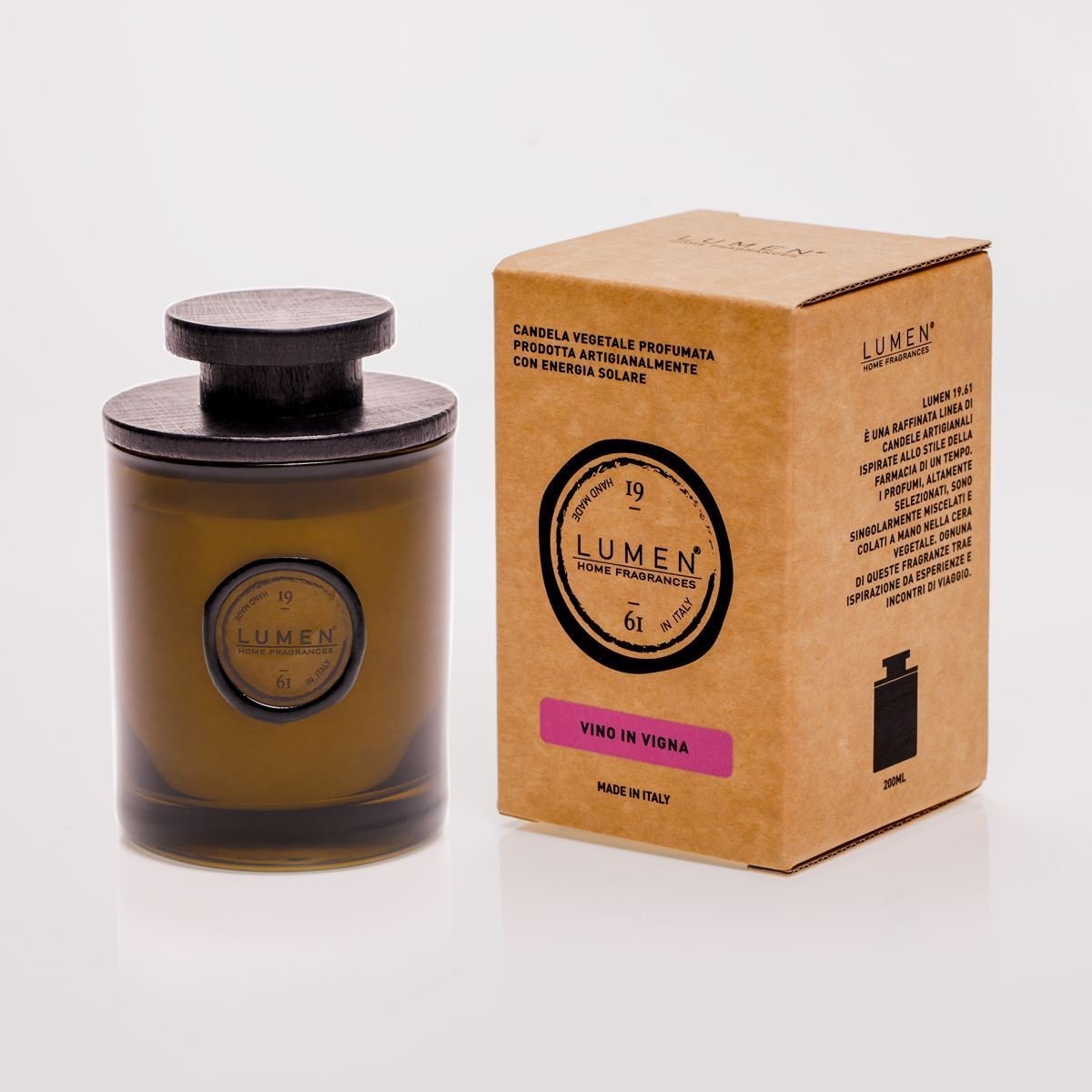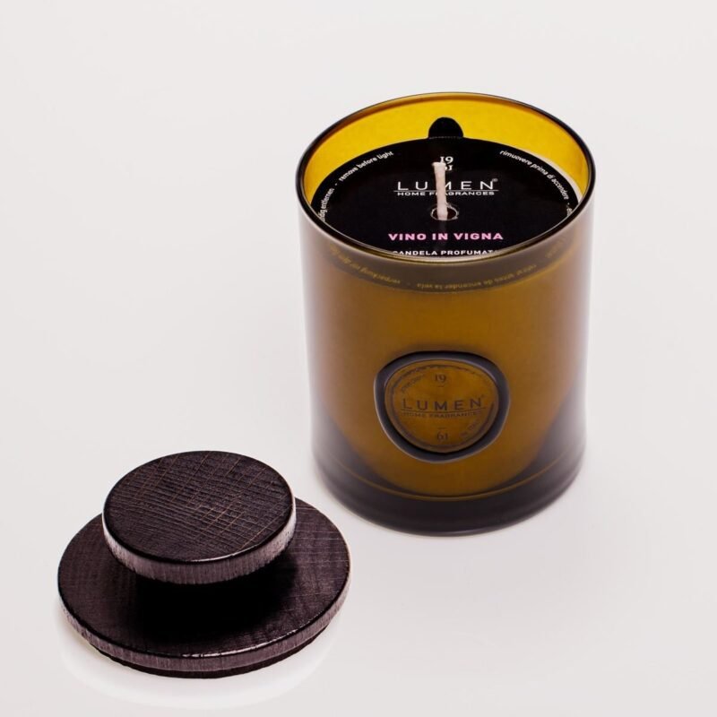 Vegetable candle in burnished green glass with black wooden pharmacy lid, FCS certified cardboard packaging