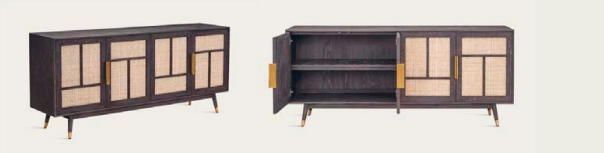 4-door sideboard with handles and inner shelves. Made of layered wood, solid Oak wood, and ribbed. Wooden base with metal feet. Handcrafted.
